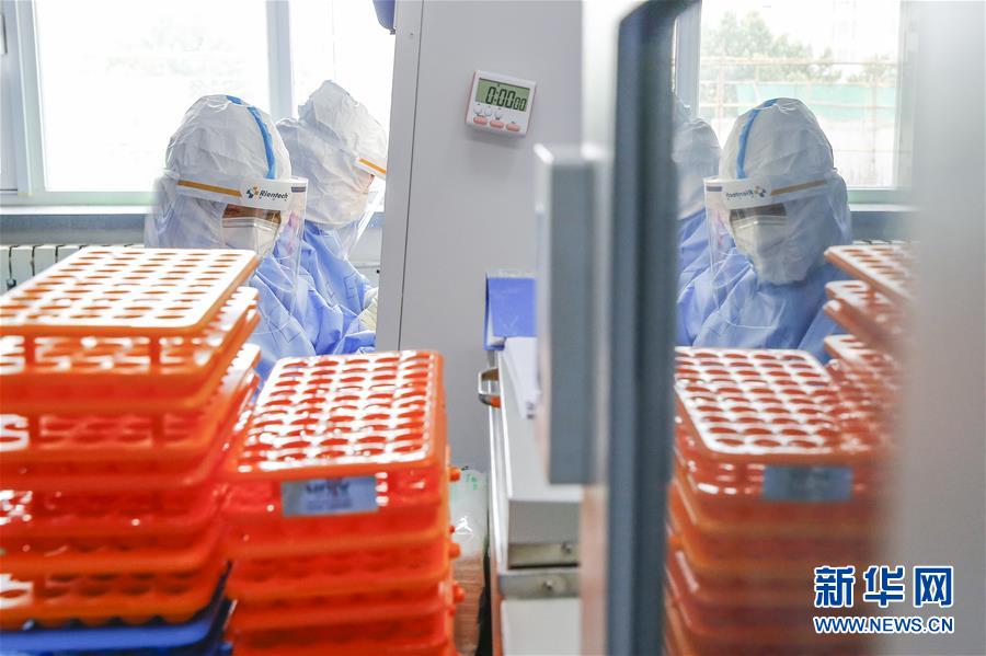 7月3日,中日友好醫(yī)院檢驗科新冠核酸檢測實(shí)驗室的檢驗人員閆克芹和張鑫(左)在實(shí)驗室內(nèi)處理剛剛送到的樣本。新華社記者張玉薇攝