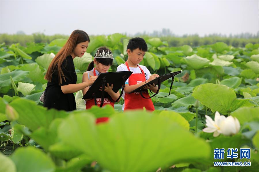 7月3日,游客在曲周縣勝豐蓮藕種植專業(yè)合作社荷塘景區(qū)寫生。時(shí)值夏日,河北省曲周縣勝豐蓮藕種植專業(yè)合作社荷塘景區(qū)的荷花競(jìng)相綻放,吸引眾多游人前來觀光游覽。新華社記者 王曉 攝