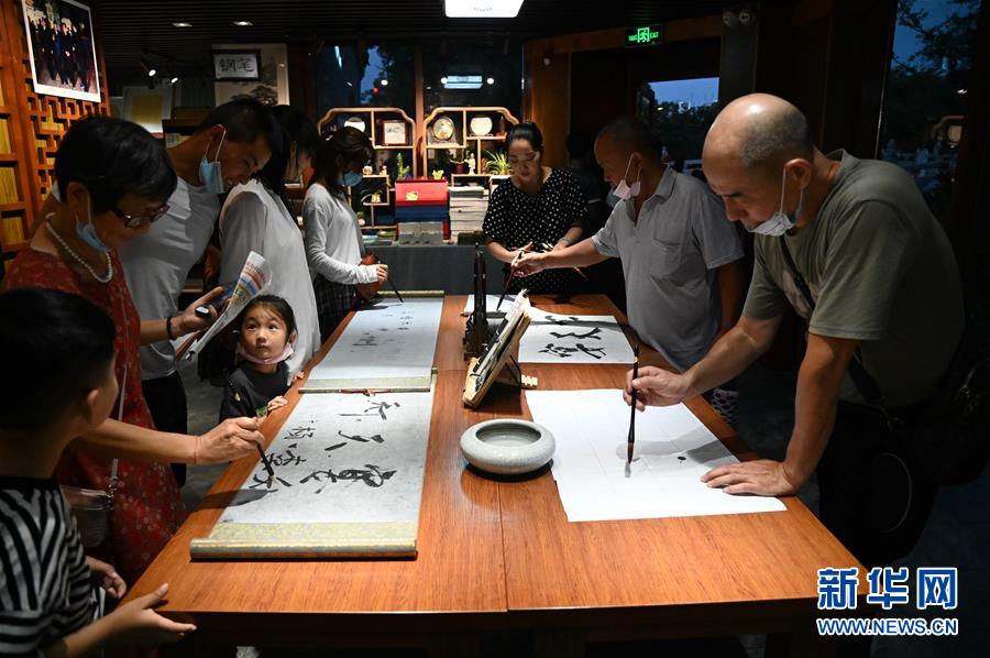 游客在洛陽市洛邑古城的汝陽劉毛筆店內(nèi)參觀體驗(6月29日攝)。新華社記者 張浩然 攝