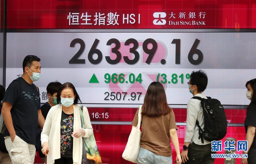 7月6日,人們從位于香港中環(huán)的股市信息屏前經過。香港恒生指數6日漲966.04點,漲幅3.81%,收報26339.16點。全日主板成交2507.97億港元。新華社記者李鋼攝