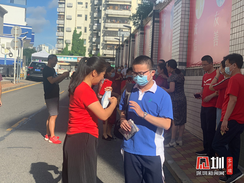 考生學(xué)長(zhǎng)來到深圳紅嶺中學(xué)考點(diǎn)門口為學(xué)弟舉起“奧利給”的旗子。