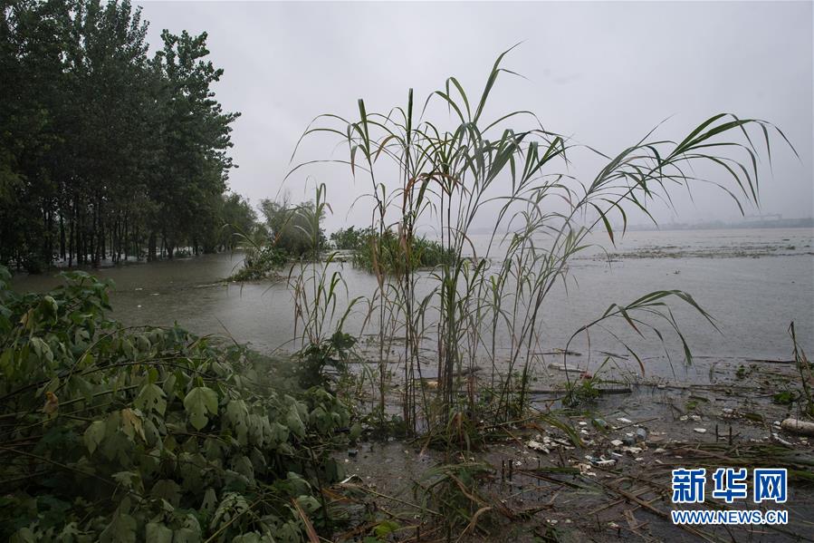 7月7日,上漲的江水淹沒武漢天興洲江邊的部分植被。新華社記者肖藝九攝