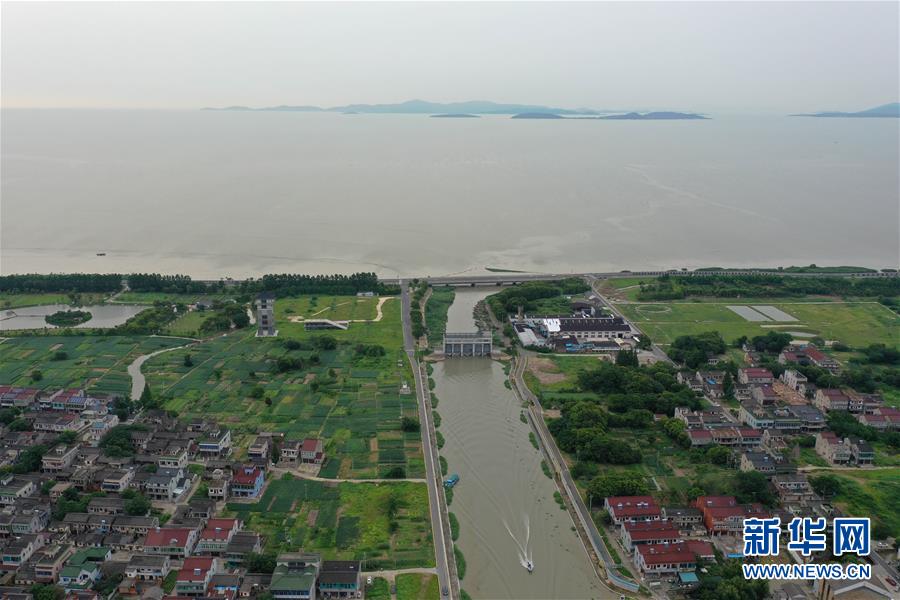 7月7日無人機(jī)拍攝的吳興高新區(qū)幻溇村連通太湖的水閘。太湖水位近期持續(xù)上漲。近日,位于浙江北部的湖州市遭遇多輪降雨,東部平原河網(wǎng)普遍超警戒水位,水庫(kù)山塘高位運(yùn)行。7月5日12時(shí)30分,湖州市人民政府防汛防旱指揮部將防汛應(yīng)急響應(yīng)提升至Ⅲ級(jí),要求各地密切監(jiān)測(cè)汛情,切實(shí)做好各項(xiàng)防范工作,確保安全度汛。新華社記者黃宗治攝