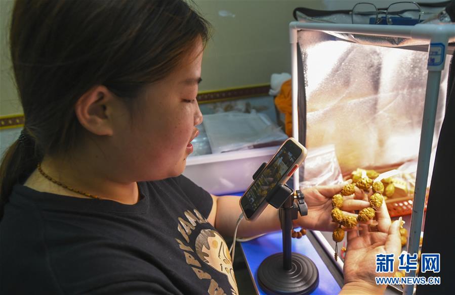 7月7日,河北省永清縣別古莊鎮(zhèn)核雕企業(yè)網(wǎng)絡(luò)主播在網(wǎng)絡(luò)直播銷售核雕產(chǎn)品。河北省永清縣有核雕企業(yè)1500余家,相關(guān)從業(yè)人員4萬余人。今年以來,該縣克服疫情影響,廣泛利用電商平臺進(jìn)行網(wǎng)絡(luò)直播銷售,網(wǎng)上銷售額已占總銷售額的90%以上,有效緩解了線下銷售壓力,為當(dāng)?shù)貛砹己玫慕?jīng)濟(jì)效益。新華社記者李曉果攝