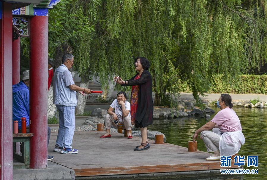 在烏魯木齊人民公園的一處角落里,戲迷們?cè)诰毘?月5日攝)。新華社記者趙戈攝