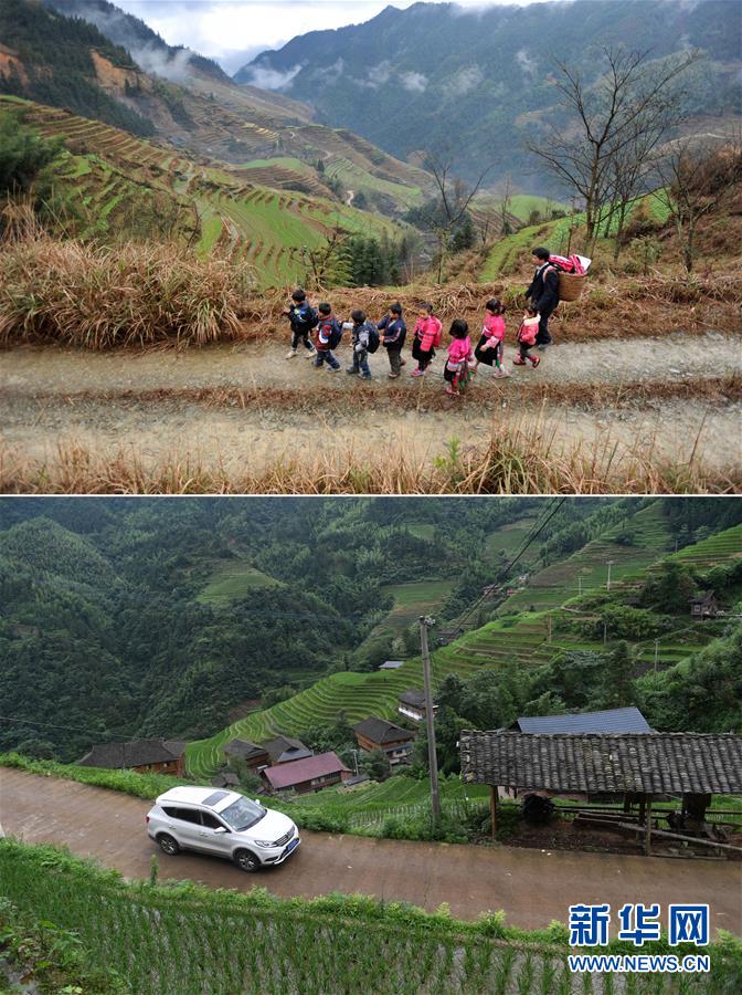 這是一張拼版照片,上圖:在廣西龍勝龍脊鎮(zhèn)江柳村,余啟貴老師背著背簍領(lǐng)著學(xué)生去學(xué)校(2013年2月26日攝);下圖:在廣西龍勝龍脊鎮(zhèn)江柳村,余啟貴老師開(kāi)著自己的汽車帶著學(xué)生去學(xué)校(7月7日攝)。新華社記者陸波岸攝