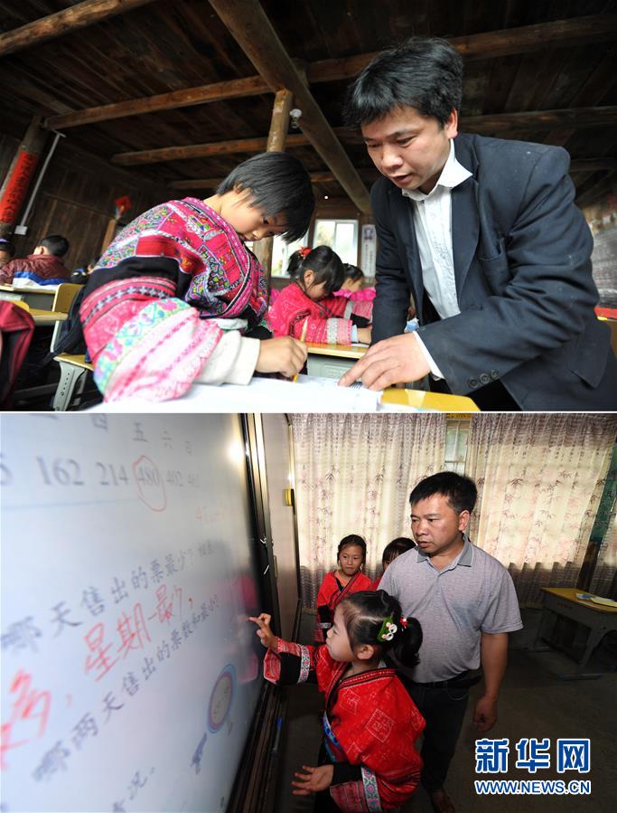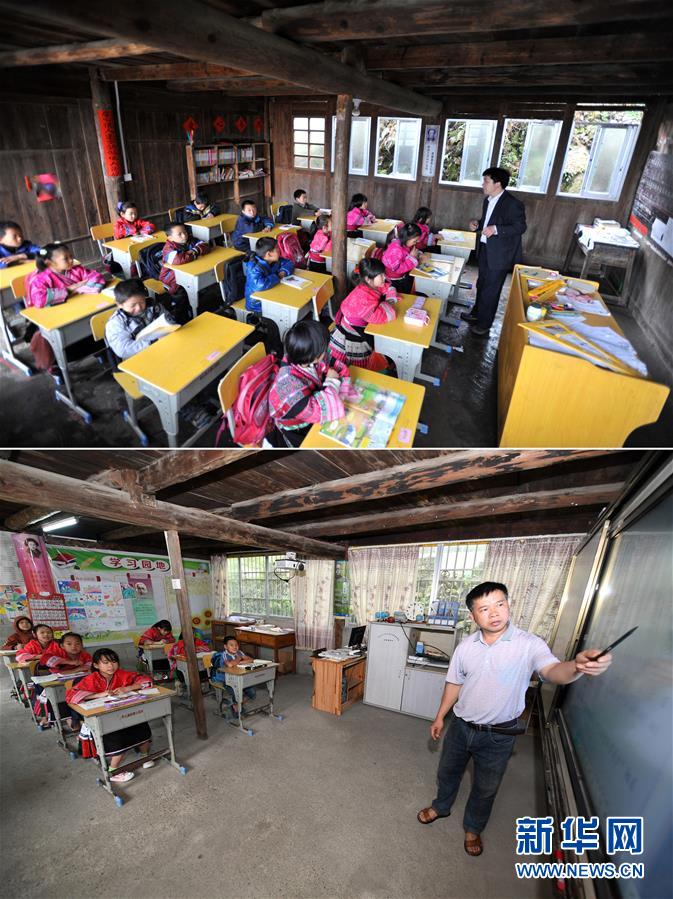 這是一張拼版照片,上圖:在廣西龍勝龍脊鎮(zhèn)江柳村翁江小學(xué),余啟貴老師在給學(xué)生上課(2013年2月26日攝);下圖:在廣西龍勝龍脊鎮(zhèn)江柳村翁江小學(xué),余啟貴老師在給學(xué)生上課(7月7日攝)。新華社記者陸波岸攝