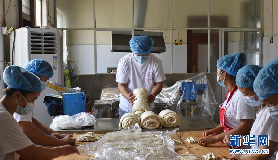 7月8日,張亞釗(中)在車間加工面團(tuán)。新華社記者韓朝陽攝