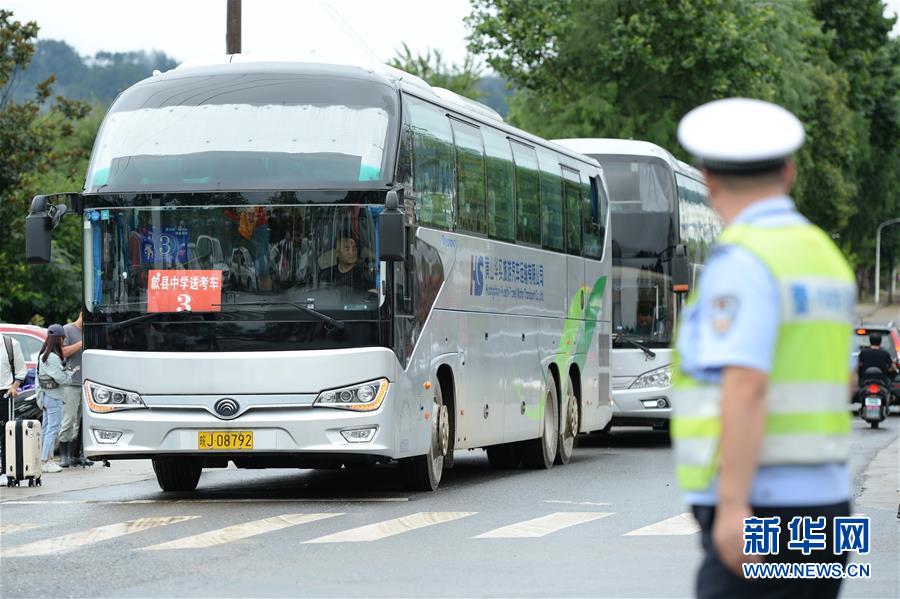 7月9日,接送考生的大巴車抵達(dá)歙縣第二中學(xué)考點(diǎn)。受強(qiáng)降雨影響,2020年高考安徽歙縣考區(qū)7月7日未能如期開考,經(jīng)研究并報教育部批準(zhǔn),歙縣考區(qū)于9日啟用2020年普通高等學(xué)校招生全國統(tǒng)一考試語文、數(shù)學(xué)(文、理)科目副題進(jìn)行考試。新華社記者黃博涵攝