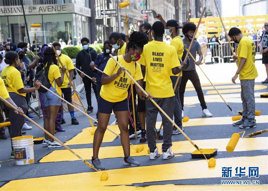 7月9日,在美國紐約第五大道特朗普大廈前,人們涂寫“黑人的命也是命”標(biāo)語。當(dāng)天,數(shù)十人在紐約第五大道特朗普大廈前的路面上涂寫“黑人的命也是命”標(biāo)語。紐約市計劃在多處地點涂寫“黑人的命也是命”標(biāo)語。新華社記者王迎攝