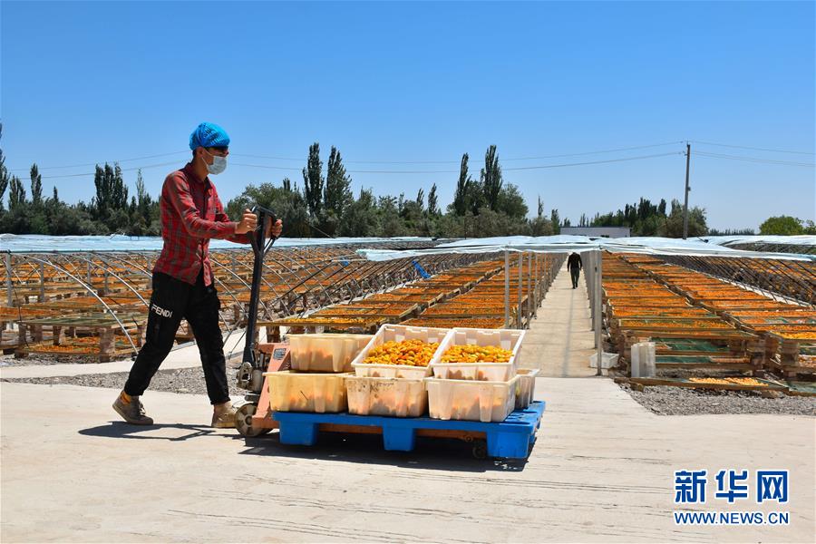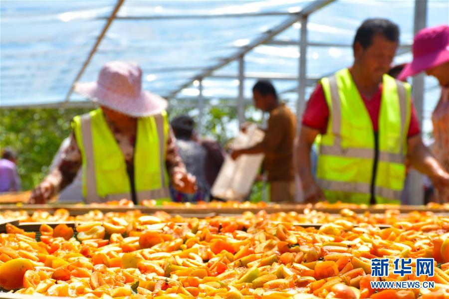 在新疆英吉沙縣一家合作社內(nèi),員工在晾曬杏子(7月2日攝)。新華社記者高晗攝
