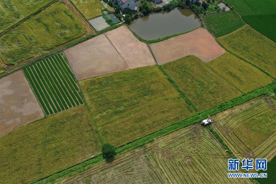 7月11日,在湖南省衡陽市衡陽縣臺(tái)源鎮(zhèn)臺(tái)九村,村民駕駛收割機(jī)收割早稻(無人機(jī)照片)。近日,湖南各地農(nóng)村陸續(xù)進(jìn)入“雙搶”季,農(nóng)民緊抓農(nóng)時(shí),搶收搶種,力爭糧食穩(wěn)產(chǎn)豐收。新華社記者趙眾志攝