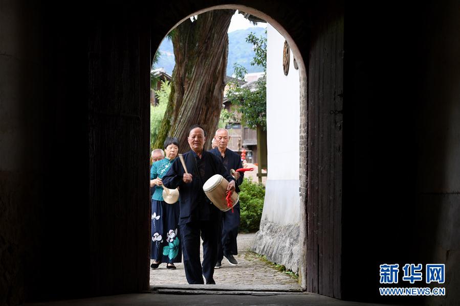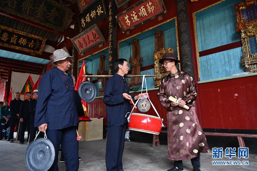 7月4日,浦源村民在村里的鄭氏宗祠集合,準(zhǔn)備展示魚祭習(xí)俗。魚祭習(xí)俗是為死去的鯉魚舉行送葬儀式,是浦源村特有的習(xí)俗。新華社記者 姜克紅 攝