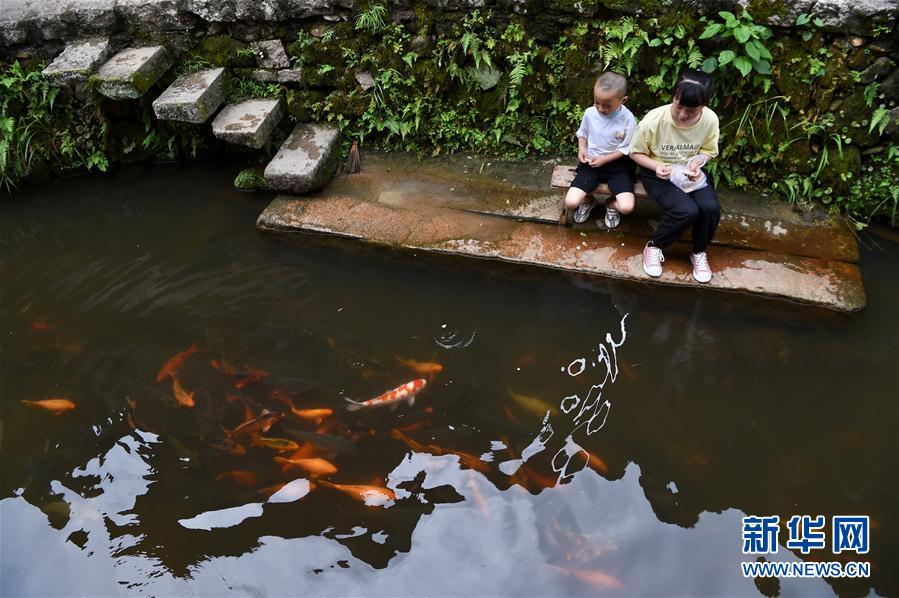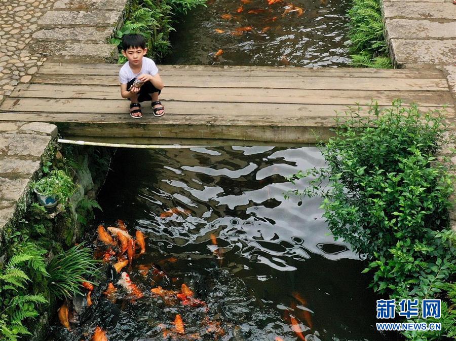 7月3日,一名男孩在浦源村鯉魚溪畔喂食溪中的鯉魚。新華社記者 姜克紅 攝