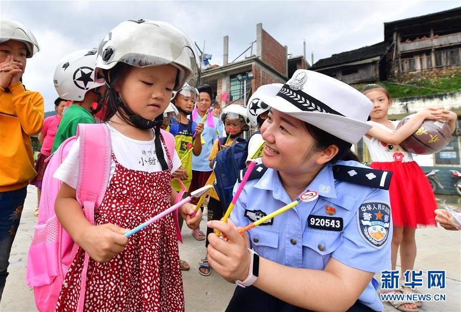 7月11日,柳州市交警支隊民警給小朋友贈送交通標志鉛筆。當日,廣西柳州市交警支隊的民警來到融水苗族自治縣大浪鎮(zhèn)大新村紅鄧屯教學點,開展暑期交通安全教育活動,增強孩子們的安全出行意識。新華社記者黃孝邦攝