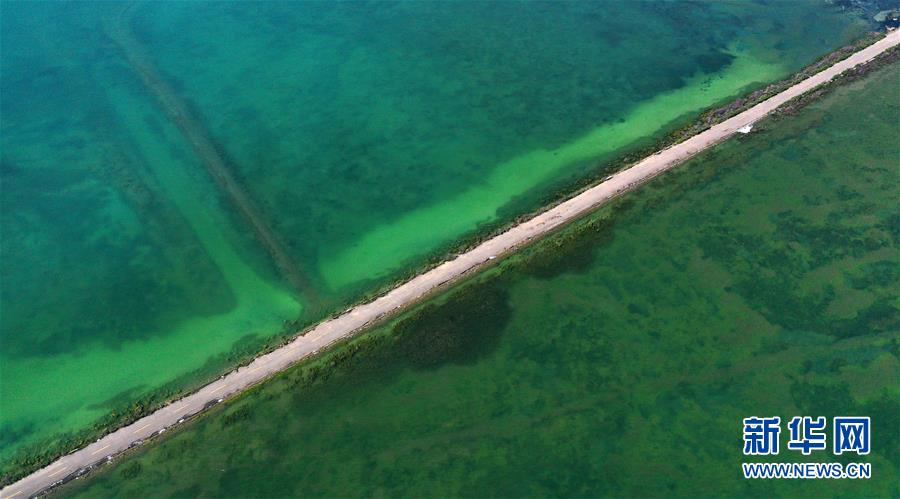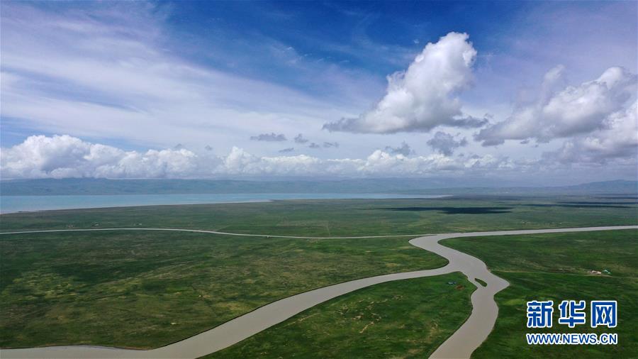7月10日拍攝的青海湖風(fēng)光(無(wú)人機(jī)照片)。盛夏時(shí)節(jié),被譽(yù)為“中國(guó)最美湖泊”的青海湖畔景色宜人,藍(lán)天、白云、湖水與草原組成一幅壯美的畫卷。新華社記者 張宏祥 攝