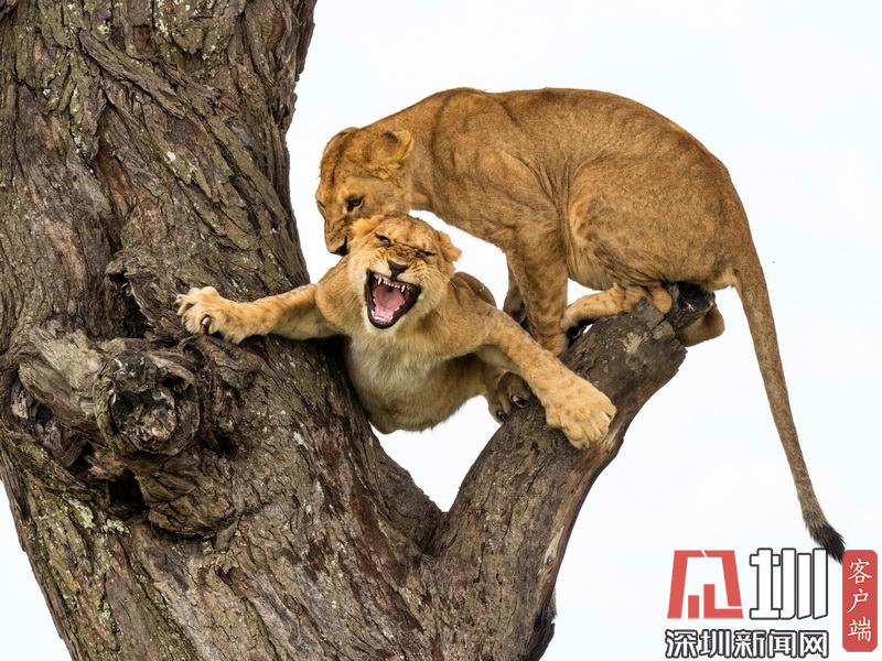 2020年7月13日?qǐng)?bào)道(具體拍攝時(shí)間不詳),Sandesh Kadur是一名印度野生動(dòng)物攝影師,他在坦桑尼亞塞倫蓋蒂國(guó)家公園拍攝到一系列“獅子上樹”的精彩照片。畫面中,有一只憤怒的母獅為了捍衛(wèi)自己在樹上的位置,一邊劈叉一邊對(duì)著鏡頭咆哮,有兩只獅子為了爭(zhēng)奪位置互相攻擊,還有一只獅子在找到舒適的位置后呼呼大睡。