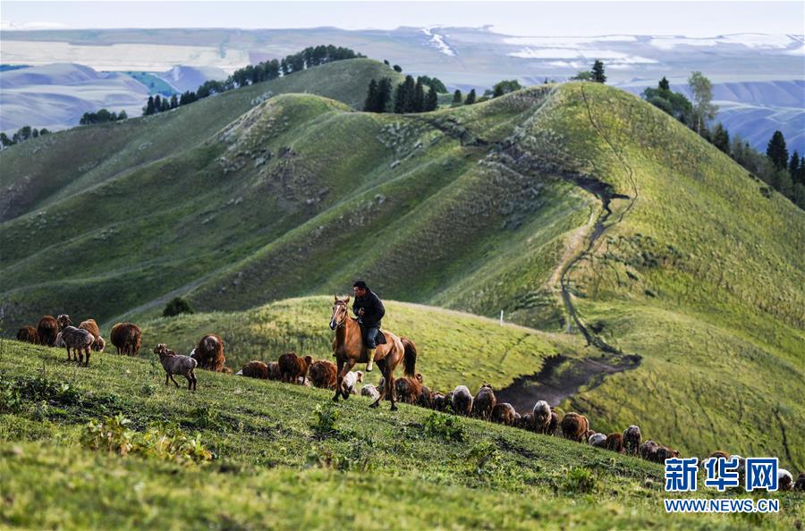 在新疆伊犁特克斯縣境內(nèi)的夏牧場里,一位牧民在放牧(6月30日攝)。新華社記者 王菲 攝