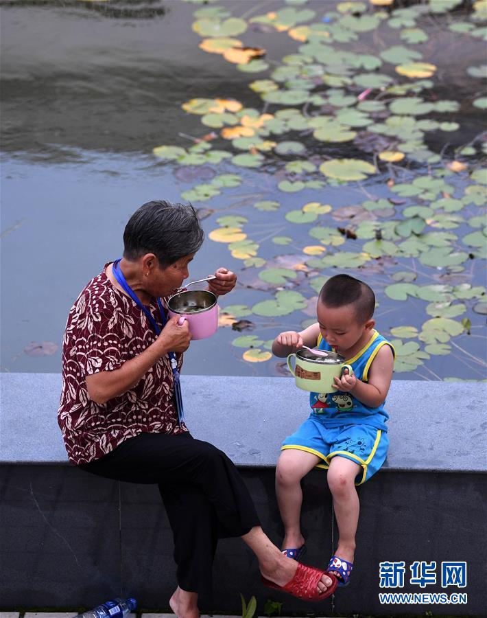 7月14日,在宿松縣洲頭鄉(xiāng)中心小學(xué)集中安置點(diǎn),洲頭鄉(xiāng)泗洲村的村民在吃晚餐。近日,安徽省宿松縣洲頭鄉(xiāng)泗洲村的300多名村民因洪水被轉(zhuǎn)移到該鄉(xiāng)中心小學(xué)集中安置點(diǎn)。安置點(diǎn)工作人員、志愿者利用學(xué)校食堂為村民們烹飪飯菜,讓村民們?cè)诎仓命c(diǎn)吃上熱騰騰的三餐。新華社記者 劉軍喜 攝