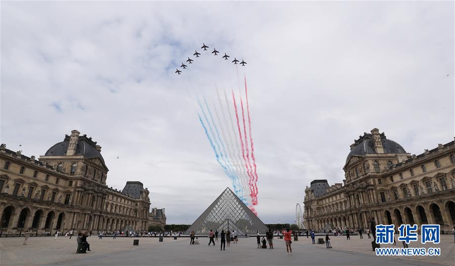 7月14日,“法蘭西巡邏兵”飛行表演隊飛過法國巴黎盧浮宮玻璃金字塔廣場。法國一年一度的國慶閱兵式14日在巴黎舉行。受疫情影響,法國總統(tǒng)馬克龍沒有在香榭麗舍大街舉行國慶閱兵式,而是在協(xié)和廣場舉行小型慶祝儀式,向在抗疫斗爭中做出貢獻的公民致敬。新華社記者高靜攝