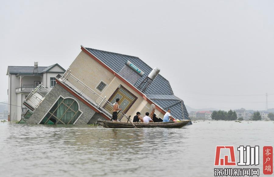 2020年7月15日,江西省鄱陽縣油墩街鎮(zhèn)同興村,村莊受到洪水圍困,大部分村民已經(jīng)被轉(zhuǎn)移出去,仍有少數(shù)村民選擇留守家中積極自救繼續(xù)生活。7月8日晚,鄱陽縣油墩街鎮(zhèn)西江因特大暴雨出現(xiàn)漫堤決口,5個(gè)行政村被洪水圍困,數(shù)萬名群眾被及時(shí)疏散轉(zhuǎn)移。同興村村民張瑤康回憶起了當(dāng)時(shí)的場景,“水一下子就涌進(jìn)來,等緩過神來趕緊向二樓轉(zhuǎn)移一樓的物品。洪水來時(shí)只從一樓搶到了一些輕便易拿的東西,冰箱、洗衣機(jī)之類的大物件,至今仍浸泡在一樓水中。”15日,記者跟隨張瑤康乘船回家,抵達(dá)后看到,一樓淹沒在水中,一個(gè)綁在二樓護(hù)欄的木梯成為進(jìn)出“家門”的唯一通道。“每天劃船去村里運(yùn)送水和食物,家里有煤氣罐和灶臺。因?yàn)?0多歲的老母親行動(dòng)不便,我們選擇留守家中?!薄半m然對岸就有安置點(diǎn),但還是更愿待在自己家里,一來是不愿意給政府添麻煩,二來能每天看著自己的房子心里踏實(shí)。”同興村村民張長來夫婦帶著剛剛領(lǐng)到的大米、方便面、飲用水乘船回到家中。記者在現(xiàn)場看到,隨著各方救援力量和物資的匯聚,被洪水圍困的村民生活雖有不便,但生活仍在繼續(xù)?!胺孔硬坏?,家就在,我們要積極面對,早日重建家園?!睆埇幙蹈嬖V記者。