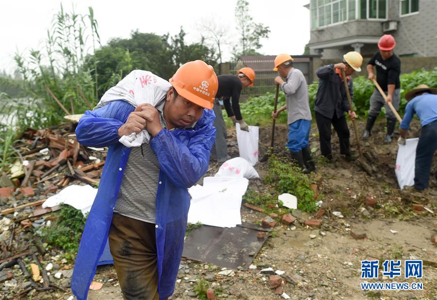 7月17日,防汛人員在秀洲區(qū)新塍鎮(zhèn)小金港村的河道邊加高堤防。浙江省嘉興市秀洲區(qū)處在杭嘉湖平原,受持續(xù)強降雨及上游排水影響,近期,秀洲區(qū)境內(nèi)的京杭大運河分支航道持續(xù)保持較高水位。當(dāng)?shù)叵嚓P(guān)部門嚴陣以待,落實各項措施,確保安全度汛。新華社記者韓傳號攝