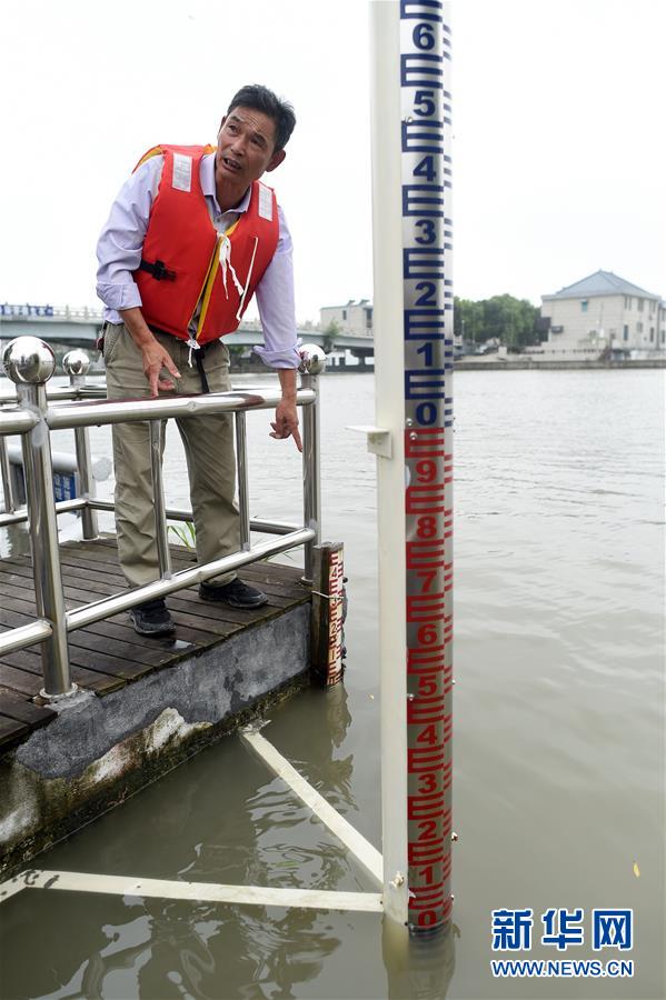 7月17日,王江涇水文站工作人員介紹京杭大運河水位情況。浙江省嘉興市秀洲區(qū)處在杭嘉湖平原,受持續(xù)強降雨及上游排水影響,近期,秀洲區(qū)境內(nèi)的京杭大運河分支航道持續(xù)保持較高水位。當(dāng)?shù)叵嚓P(guān)部門嚴陣以待,落實各項措施,確保安全度汛。新華社記者韓傳號攝