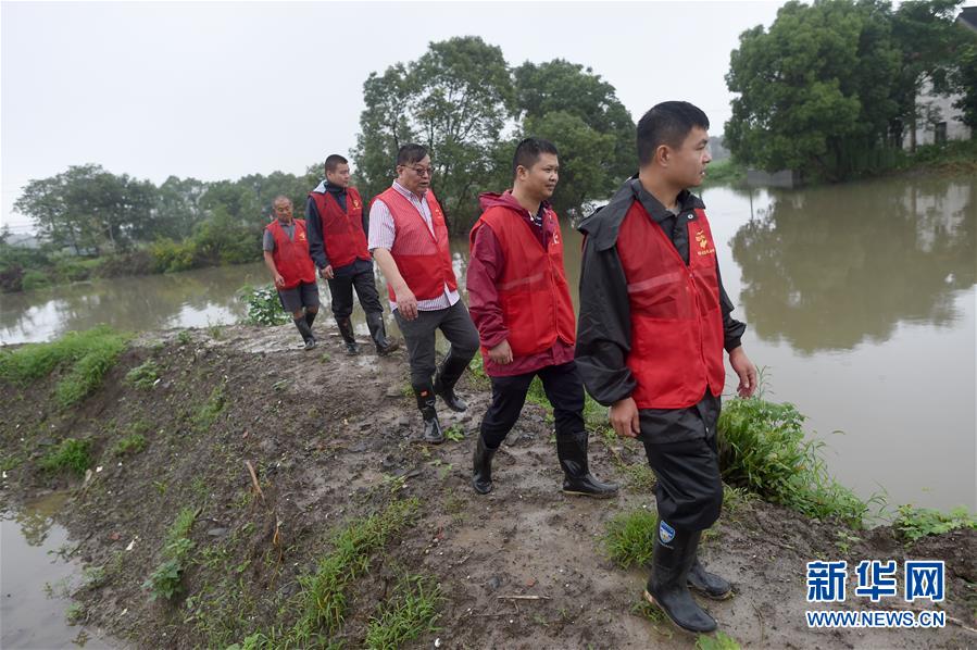 7月17日,基層網(wǎng)格員和志愿者在秀洲區(qū)新塍鎮(zhèn)小金港村的河道邊巡河。浙江省嘉興市秀洲區(qū)處在杭嘉湖平原,受持續(xù)強降雨及上游排水影響,近期,秀洲區(qū)境內(nèi)的京杭大運河分支航道持續(xù)保持較高水位。當(dāng)?shù)叵嚓P(guān)部門嚴陣以待,落實各項措施,確保安全度汛。新華社記者韓傳號攝