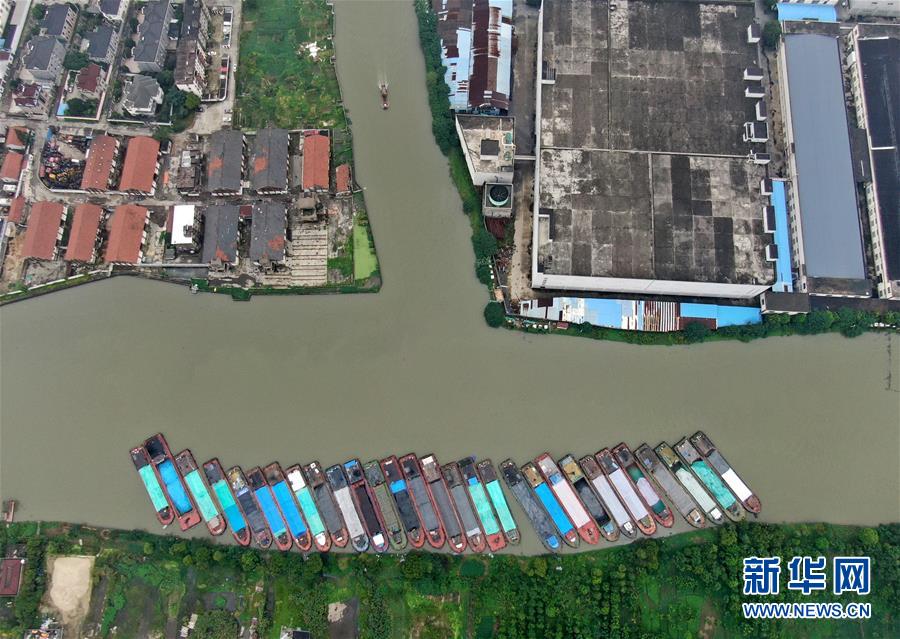 7月17日拍攝的秀洲區(qū)王江涇鎮(zhèn)境內(nèi)京杭大運(yùn)河邊臨時(shí)??康拇埃o人機(jī)照片)。浙江省嘉興市秀洲區(qū)處在杭嘉湖平原的低洼地帶,受持續(xù)強(qiáng)降雨及上游排水影響,秀洲區(qū)境內(nèi)的京杭大運(yùn)河分支航道持續(xù)保持較高水位。為確保安全度汛,秀洲區(qū)相關(guān)部門全力以赴做好防汛各項(xiàng)工作。新華社記者韓傳號(hào)攝