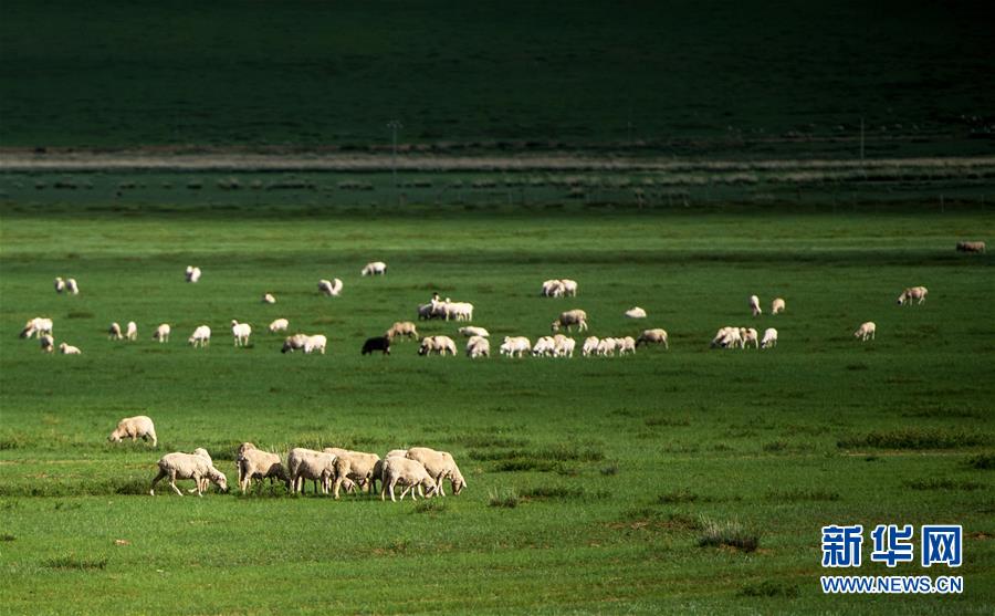 7月18日,羊群在內(nèi)蒙古錫林郭勒盟正鑲白旗境內(nèi)的草原上覓食。連日來,內(nèi)蒙古錫林郭勒盟迎來多次降雨,境內(nèi)廣袤的草原經(jīng)過雨水的滋潤,煥發(fā)出勃勃生機(jī)。新華社記者連振攝