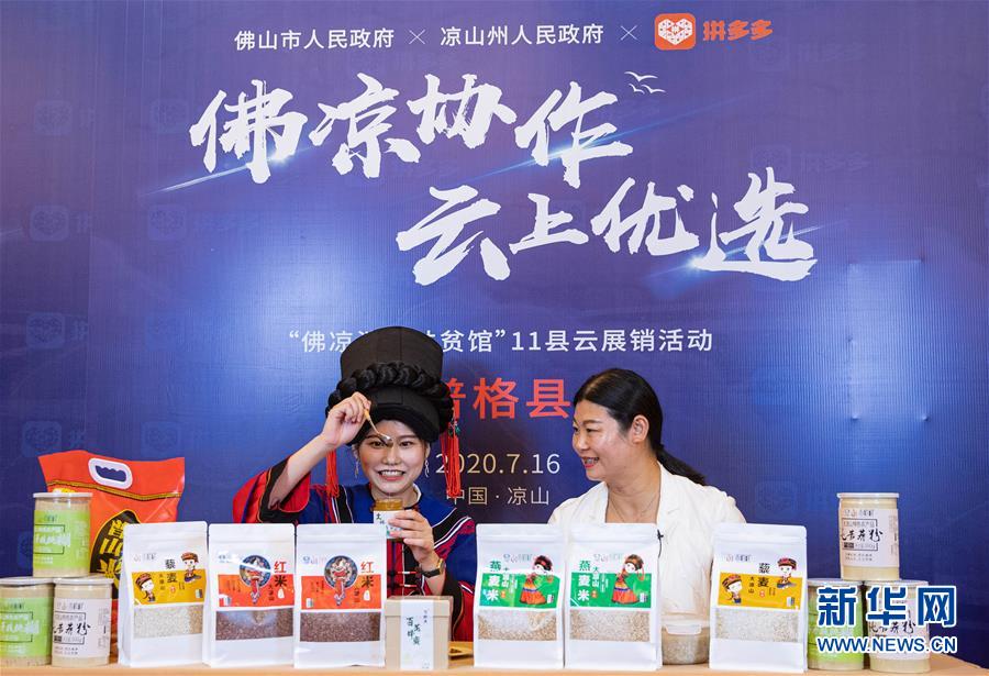7月18日,在涼山州昭覺縣粵川東西部扶貧協(xié)作項(xiàng)目產(chǎn)業(yè)園,昭覺縣縣長赫紹洪(右)在直播活動中向網(wǎng)友推薦農(nóng)特產(chǎn)品。新華社記者江宏景攝