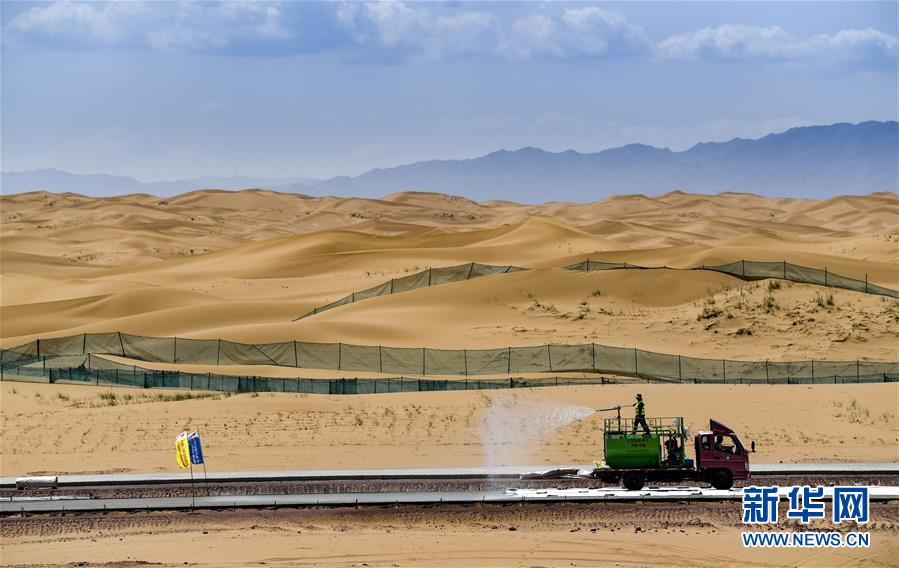 7月10日,工人在位于寧夏境內(nèi)的烏瑪高速青銅峽至中衛(wèi)段A9標段施工。盛夏時節(jié),位于寧夏境內(nèi)的烏瑪(內(nèi)蒙古烏海市至青?,斍呖h)高速青銅峽至中衛(wèi)段正在抓緊施工建設。該路段主線全長122.9公里,其中穿越騰格里沙漠腹地的18公里公路是寧夏建設的首條沙漠高速公路,預計2021年建成通車。新華社記者馮開華攝