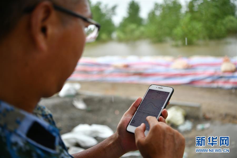 劉良武在手機上查詢水位情況(7月19日攝)。新華社記者李鑫攝