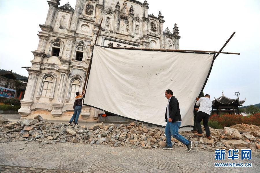 2019年3月19日,在天柱縣坌處鎮(zhèn)三門塘村,黃宜印(中)在搭建電影播放幕布。侗族青年黃宜印是貴州省黔東南苗族侗族自治州天柱縣的一名公益電影放映員。從2014年起,他常年行走在大山里,為山區(qū)群眾播放電影。僅2018年,黃宜印就在天柱縣的37個(gè)村寨播放電影444場(chǎng)。新華社記者歐東衢攝