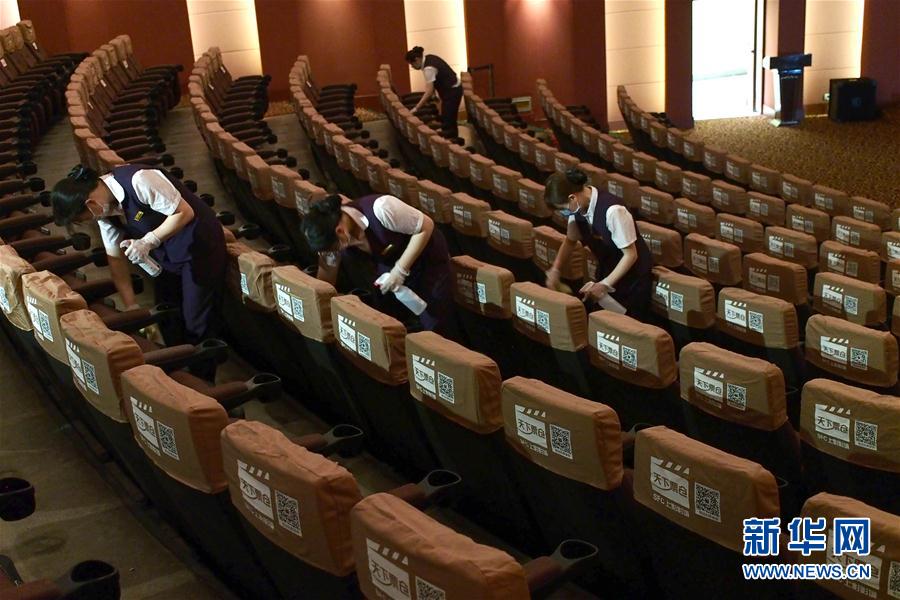 2020年7月19日,上海影城員工在放映廳里為座位消毒。當(dāng)日,上海部分電影院為恢復(fù)開放營(yíng)業(yè)進(jìn)行最后階段準(zhǔn)備。新華社記者任瓏攝