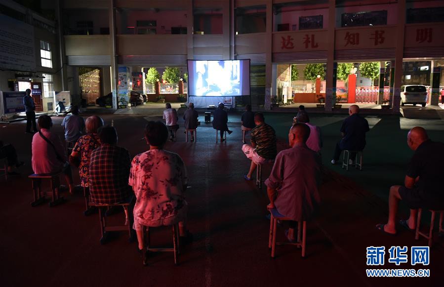 7月20日,轉(zhuǎn)移安置的群眾在安徽省安慶市迎江區(qū)華中路三小集中安置點看露天電影。新華社記者周牧攝