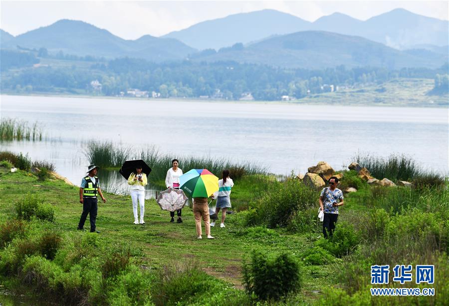 草海巡護員(左一)在勸導游客不要擅自進入草海保護區(qū)內(nèi)游覽(6月10日攝)。新華社記者楊文斌攝