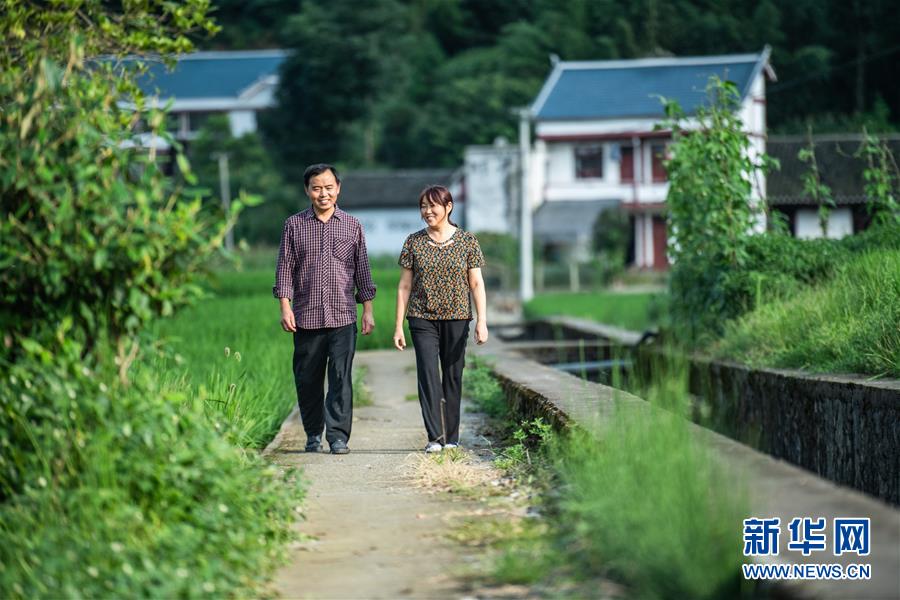 母先才和妻子在花茂村里散步(7月14日攝)。新華社記者 陶亮 攝
