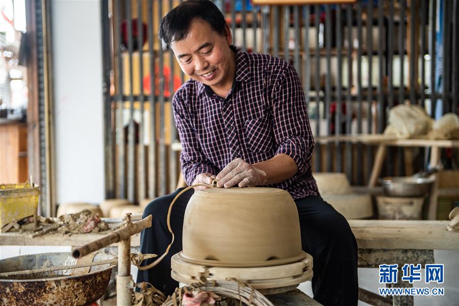 母先才在自家陶藝館里制作陶器(6月16日攝)。新華社記者 陶亮 攝