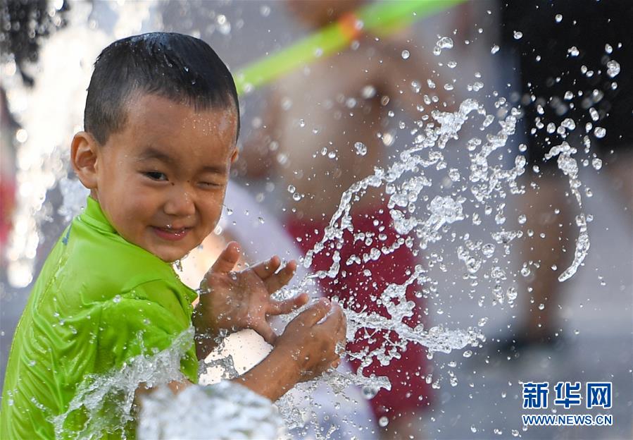 7月24日,一名小男孩在北京華熙LIVE·五棵松商業(yè)街區(qū)的一處噴泉戲水。北京市氣象局7月24日傍晚發(fā)布稱,24日截至16時30分,平原大部分地區(qū)出現(xiàn)37℃以上高溫天氣,局地氣溫超過40℃。北京市已于23日發(fā)布高溫藍(lán)色預(yù)警,預(yù)計25日全市大部分地區(qū)日最高氣溫仍將達(dá)35℃以上。新華社記者陳曄華攝
