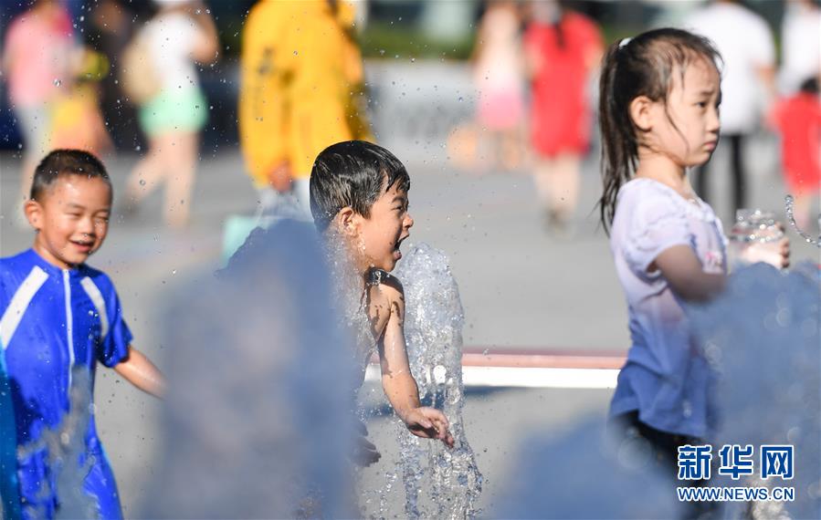 7月24日,孩子們在北京華熙LIVE·五棵松商業(yè)街區(qū)的一處噴泉戲水。北京市氣象局7月24日傍晚發(fā)布稱,24日截至16時30分,平原大部分地區(qū)出現(xiàn)37℃以上高溫天氣,局地氣溫超過40℃。北京市已于23日發(fā)布高溫藍(lán)色預(yù)警,預(yù)計25日全市大部分地區(qū)日最高氣溫仍將達(dá)35℃以上。新華社記者陳曄華攝