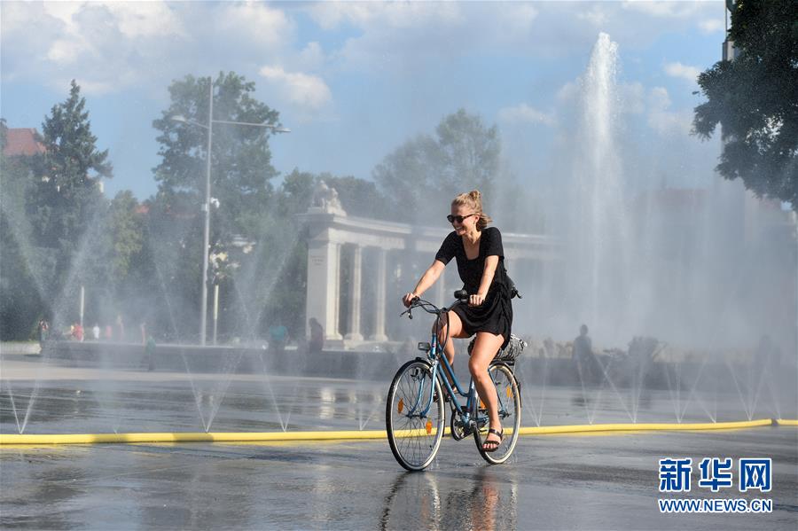 7月28日,在奧地利維也納,一名女子騎車經(jīng)過一處廣場的噴水設(shè)施。當(dāng)日,維也納市中心的最高氣溫達(dá)到37.2攝氏度,不少市民戲水消暑。新華社記者郭晨攝