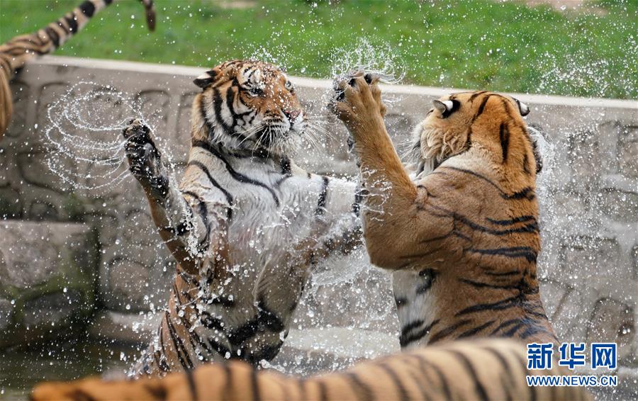 7月28日在橫道河子?xùn)|北虎林園拍攝的在水中納涼的東北虎。時(shí)值盛夏,位于黑龍江省海林市的橫道河子?xùn)|北虎林園的東北虎活動量減少,以不同方式消夏納涼。新華社記者王建威攝