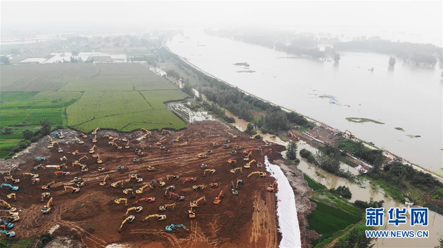 7月28日,在姜唐湖蓄洪區(qū)戴家湖一處涵閘險(xiǎn)情處置現(xiàn)場(chǎng),人們操作機(jī)械設(shè)備在搶筑臨時(shí)圩堤(無(wú)人機(jī)照片)。新華社記者黃博涵攝