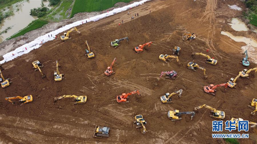 7月28日,在姜唐湖蓄洪區(qū)戴家湖一處涵閘險(xiǎn)情處置現(xiàn)場(chǎng),人們操作機(jī)械設(shè)備在搶筑臨時(shí)圩堤(無(wú)人機(jī)照片)。新華社記者張端攝