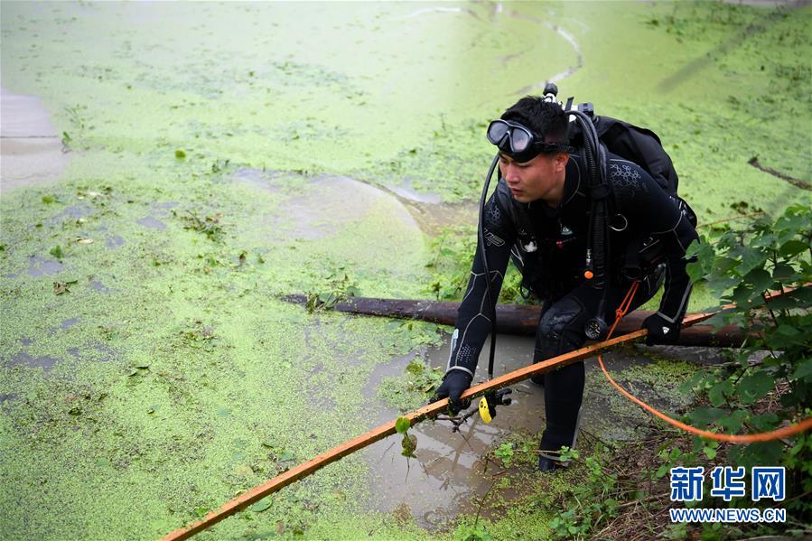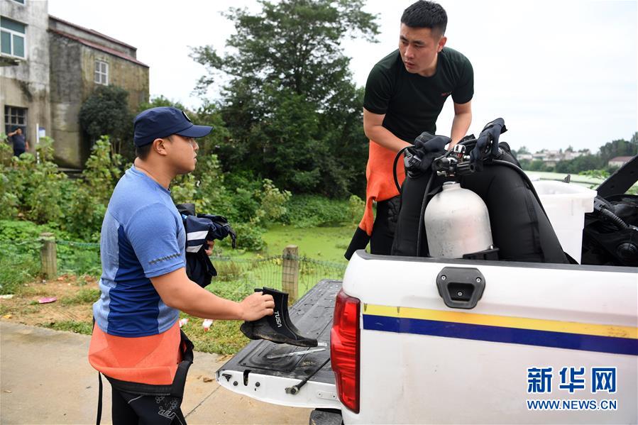 7月24日,在安徽省廬江縣臺創(chuàng)園小南河段,吳正寶(左)和徐宏林準(zhǔn)備潛水。新華社記者劉軍喜攝