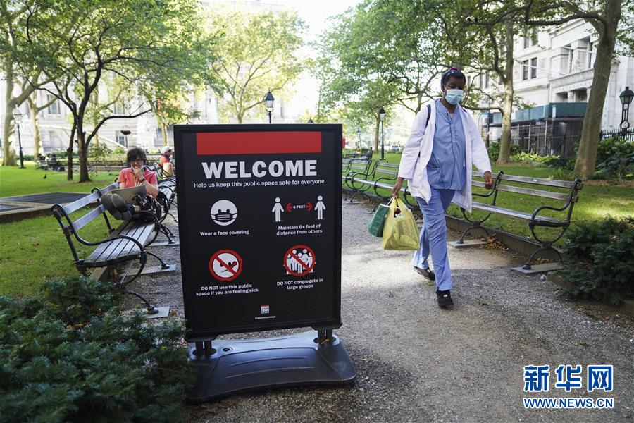 7月29日,在美國紐約,一名女子從公園內(nèi)的防疫提示牌旁走過。美國約翰斯·霍普金斯大學(xué)實(shí)時統(tǒng)計數(shù)據(jù)顯示,截至29日,美國累計新冠確診病例已超過440萬例,累計死亡病例超過15萬例。新華社記者王迎攝
