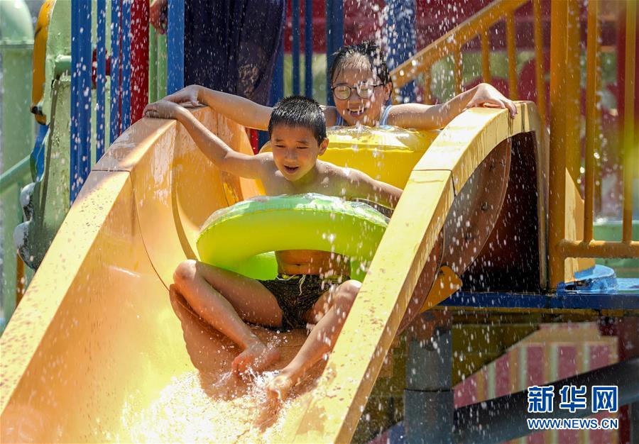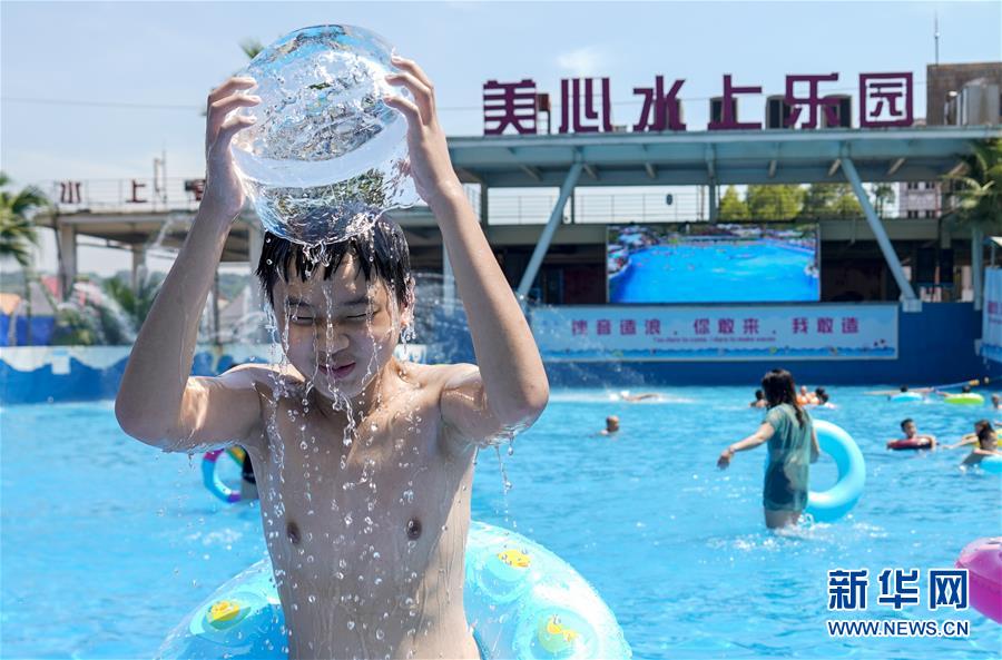 8月5日,重慶涪陵紅酒小鎮(zhèn)水上樂園內(nèi),市民在體驗(yàn)水上游樂項(xiàng)目。當(dāng)日,重慶市氣象臺再次發(fā)布“高溫橙色預(yù)警信號”,重慶大部分海拔400米以下地區(qū)日最高氣溫將升至37℃以上,局地可達(dá)40℃以上。許多重慶市民涌進(jìn)當(dāng)?shù)氐乃蠘穲@和泳池,在水中享受夏季的清涼。新華社記者劉潺攝