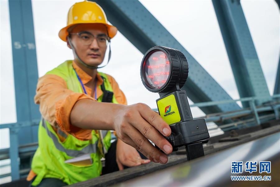 8月6日,防護(hù)員陳飛在南京長江大橋作業(yè)點(diǎn)安放施工作業(yè)防護(hù)燈。新華社記者李博攝