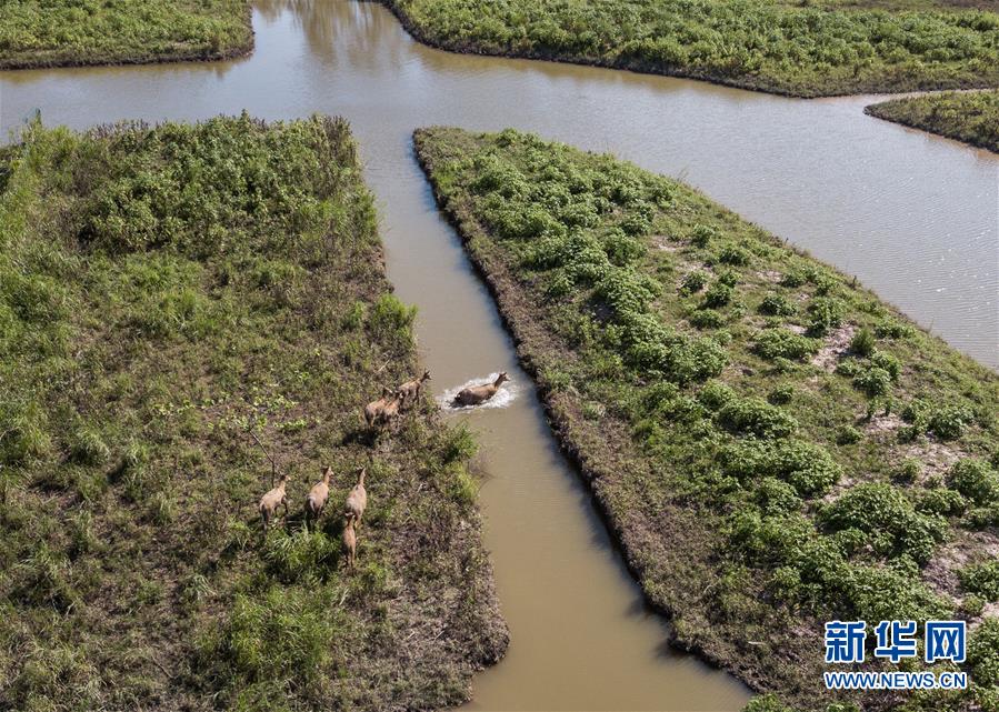 這是8月7日在東洞庭湖麋鹿和鳥類救治避難中心拍攝的麋鹿(無人機照片)。位于湖南省岳陽市的東洞庭湖麋鹿和鳥類救治避難中心成立于2016年9月,占地400余畝,中心自建成后就承擔起東洞庭湖區(qū)域全部麋鹿的救援、醫(yī)治、康復和喂養(yǎng)任務。目前該中心共有14只麋鹿正在接受救助。新華社記者李鑫攝